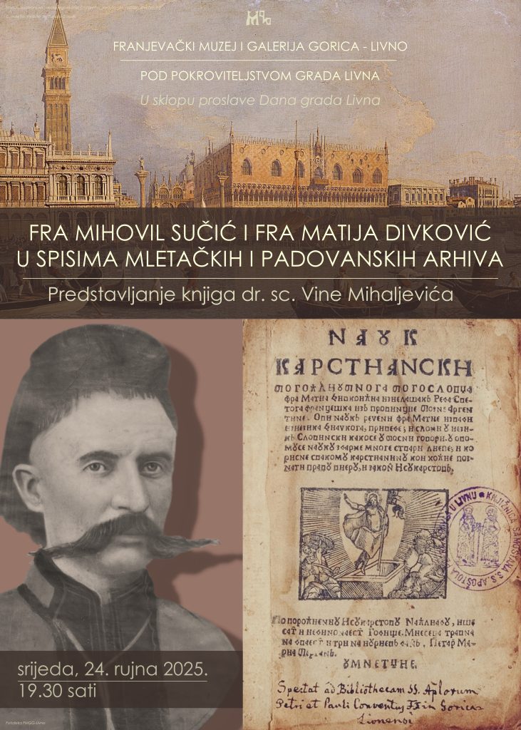 Franjevački muzej i galerija Gorica – Livno. Pod pokroviteljstvom Grada Livna. U sklopu proslave Dana grada Livna. Fra Mihovil Sučić i fra Matija Divković u spisima mletačkih i padovanskih arhiva. Predstavljanje knjige dr. sc. Vine Mihaljevića. Srijeda, 23. rujna 2025., 19.30 sati.